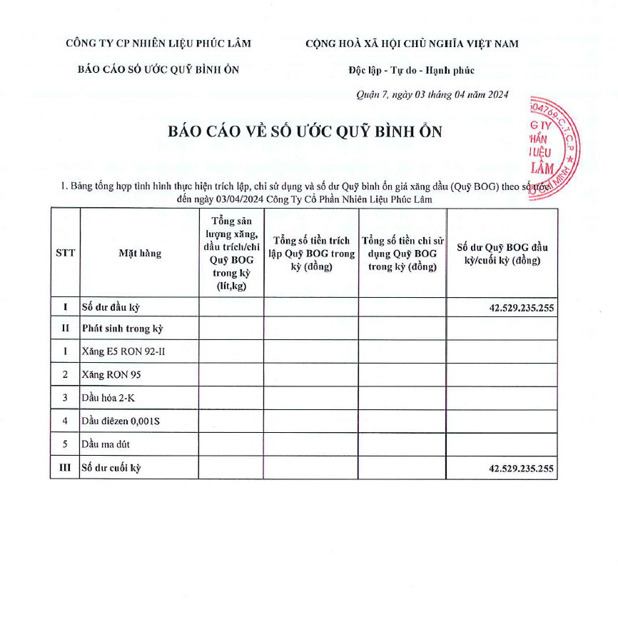 Công ty Cổ Phần Nguyên Liệu Phúc Lâm xin báo cáo Quỹ bình ổn giá xăng dầu Tuần 28.03.2024 - 03.04.2024 là: 42.529.235.255 vnđ