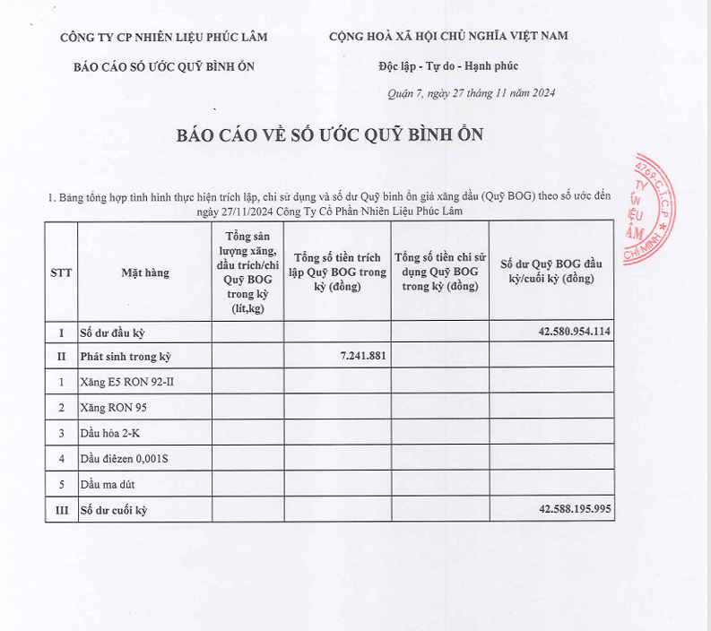 Công ty Cổ Phần Nguyên Liệu Phúc Lâm xin báo cáo Quỹ bình ổn giá xăng dầu Tuần 21.11.2024 - 27.11.2024 là: 42.588.195.995 vnđ
