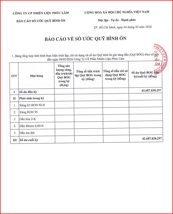 Công ty Cổ Phần Nhiên Liệu Phúc Lâm xin báo cáo Quỹ bình ổn giá xăng dầu Tuần 29.01.2026 - 04.02.2026 là: 42.687.838.297 vnđ
