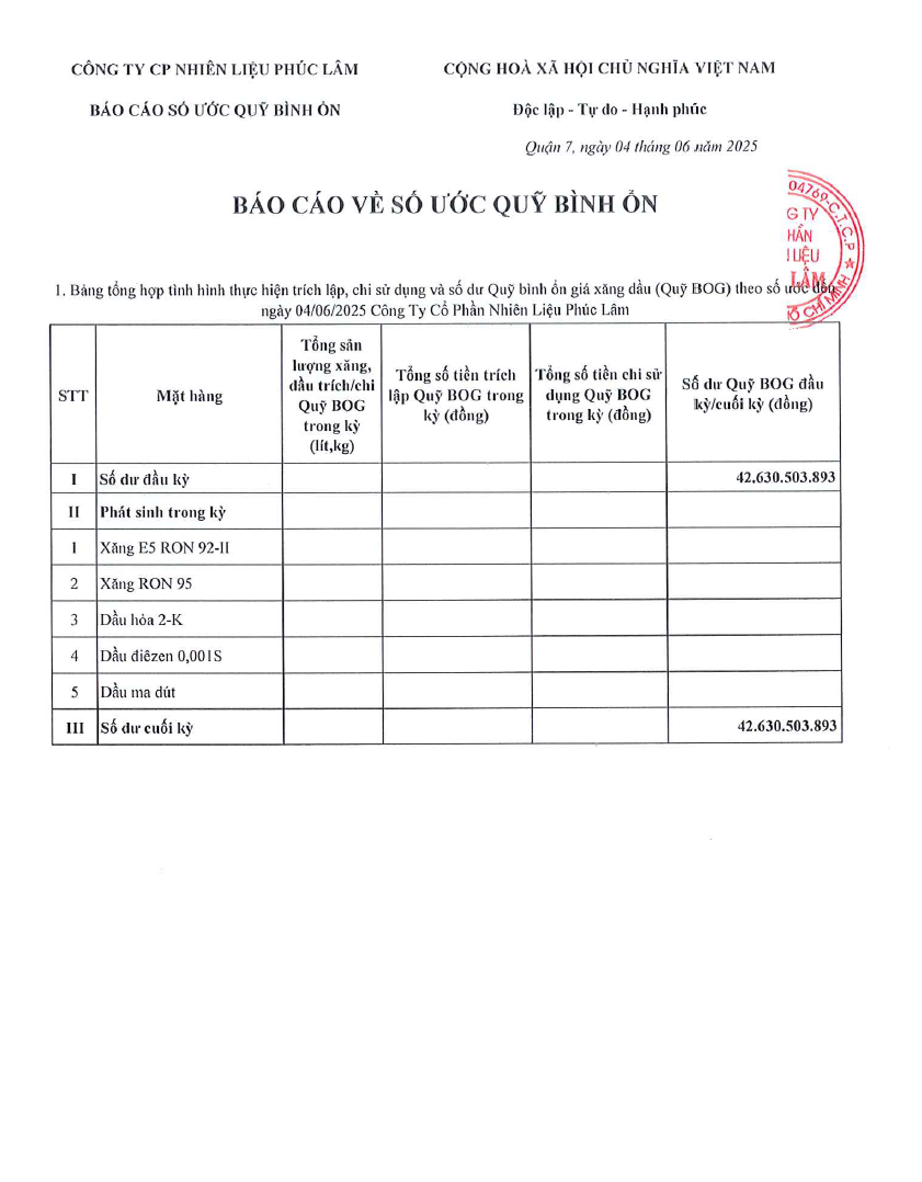 Công ty Cổ Phần Nguyên Liệu Phúc Lâm xin báo cáo Quỹ bình ổn giá xăng dầu Tuần 29.05.2025 - 04.06.2025 là: 42.630.503.893 vnđ