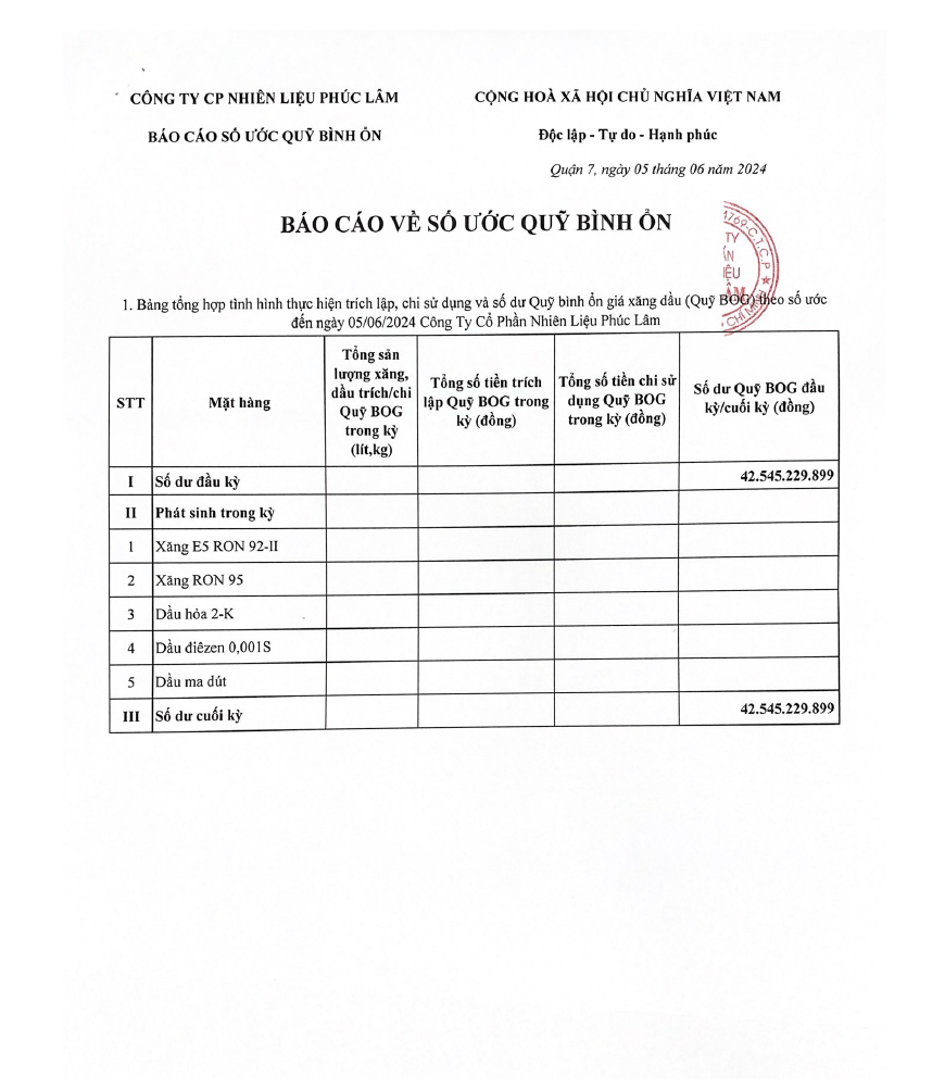 Công ty Cổ Phần Nguyên Liệu Phúc Lâm xin báo cáo Quỹ bình ổn giá xăng dầu Tuần 30.05.2024 - 05.06.2024 là: 42.545.229.899 vnđ