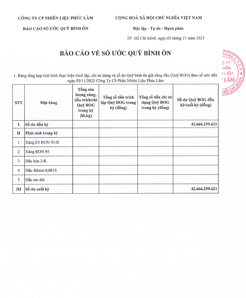 Công ty Cổ Phần Nguyên Liệu Phúc Lâm xin báo cáo Quỹ bình ổn giá xăng dầu Tuần 30.10.2025 - 05.11.2025 là: 42.666.299.621 vnđ