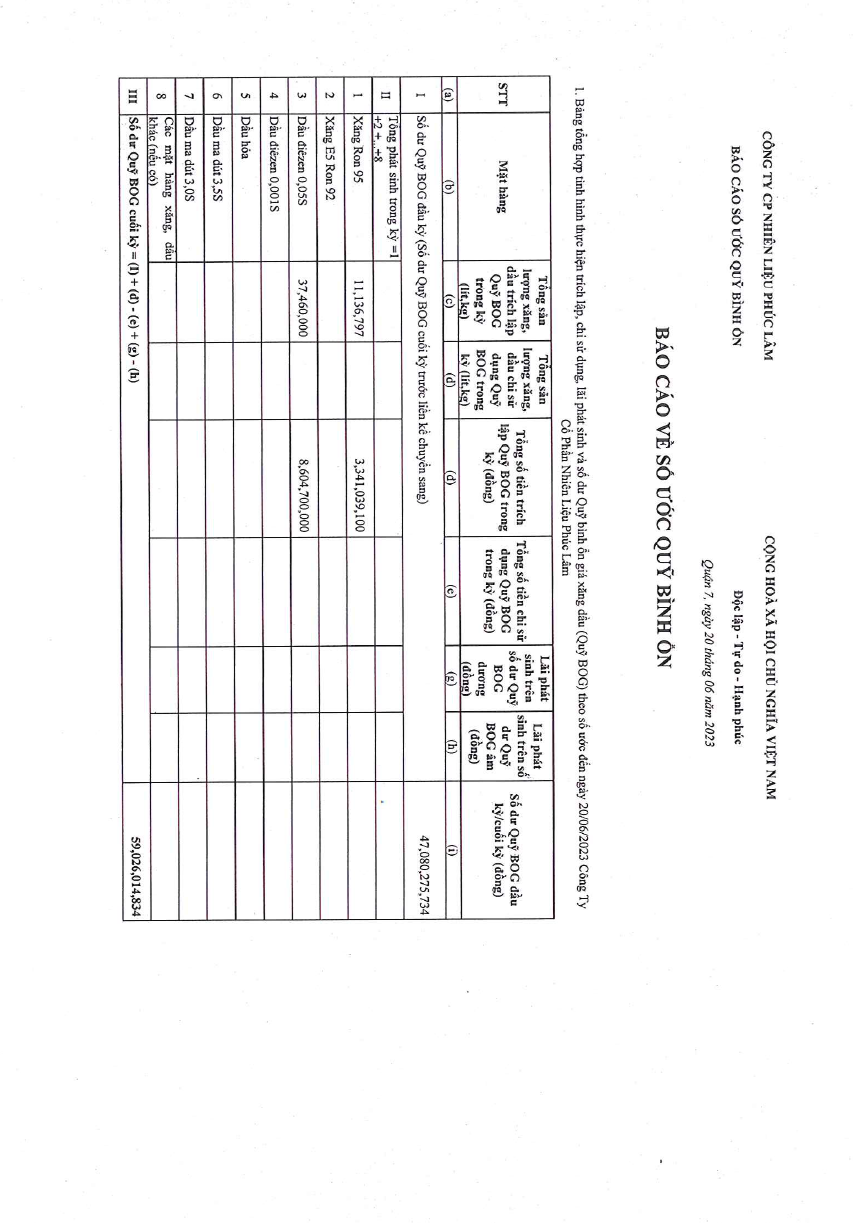 Công ty Cổ Phần Nguyên Liệu Phúc Lâm xin báo cáo Quỹ bình ổn giá xăng dầu Tuần 31.05.2023 - 20.6.2023 là: 59.026.014.834 vnđ