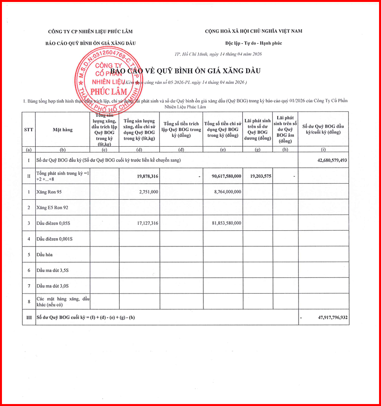 Ước tồn Quỹ BOG tại Phúc Lâm Petro Quí I Năm 2026